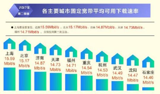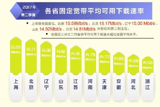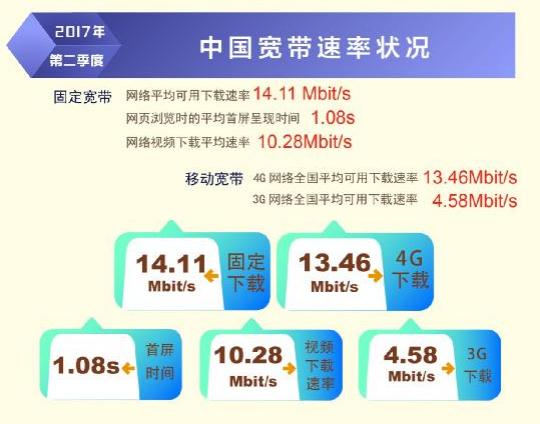 日前,寬帶發(fā)展聯(lián)盟發(fā)布了第 16 期《中國(guó)寬帶速率狀況報(bào)告》(2017 年第二季度)。報(bào)告顯示 2017 年第二季度我國(guó)固定寬帶網(wǎng)絡(luò)平均下載速率達(dá)到 14.11Mbit/s,比 2017 年第一季度提高了1.1Mbit/s,同比去年第一季度提升了 34.8%。自 2015 網(wǎng)絡(luò)“提速降費(fèi)”工作開展以來,我國(guó)固定寬帶可用下載速率連續(xù) 10 個(gè)季度持續(xù)提升,總提升幅度達(dá)到 3.3 倍。同時(shí),我國(guó)移動(dòng)寬帶用戶使用 4G 網(wǎng)絡(luò)訪問互聯(lián)網(wǎng)時(shí)的平均下載速率達(dá)到 13.46Mbit/s,環(huán)比 2017 年第一季度也有 14.2%的提升。