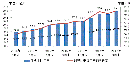 2016-2017年3月手機(jī)上網(wǎng)用戶(hù)和對(duì)移動(dòng)電話用戶(hù)滲透率情況